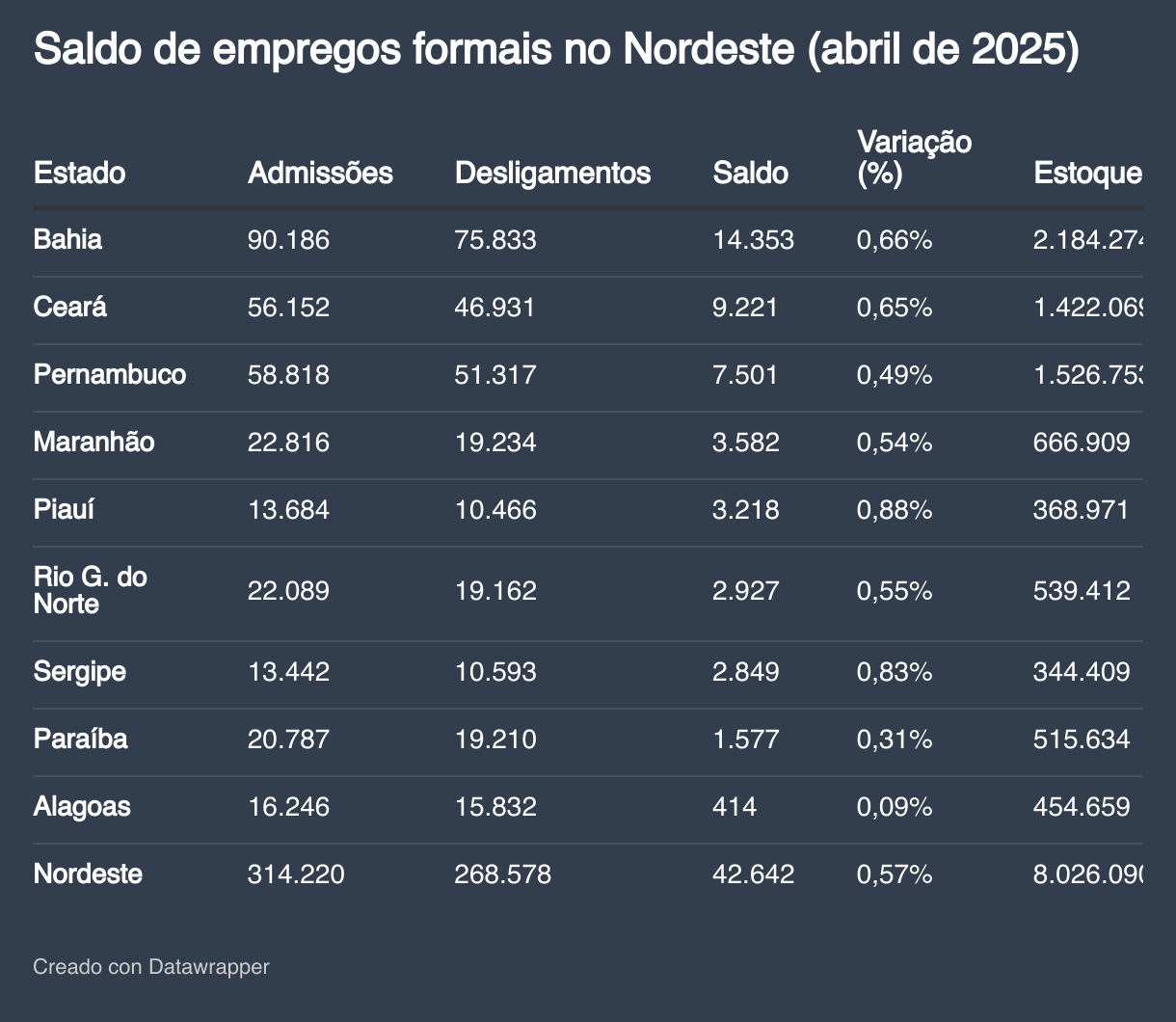 Três estados concentraram quase três quartos do saldo de empregos formais gerados no Nordeste em abril de 2025. Bahia (14.353), Ceará (9.221) e Pernambuco (7.501) somaram 73% das 42.642 novas vagas com carteira assinada na região, segundo o Cadastro Geral de Empregados e Desempregados (Novo Caged), divulgado na quarta-feira (28) pelo Ministério do Trabalho e Emprego. Em contrapartida, Alagoas teve o menor saldo entre todos os estados do país no mês: apenas 414 empregos formais criados, com variação de 0,09% no estoque estadual.