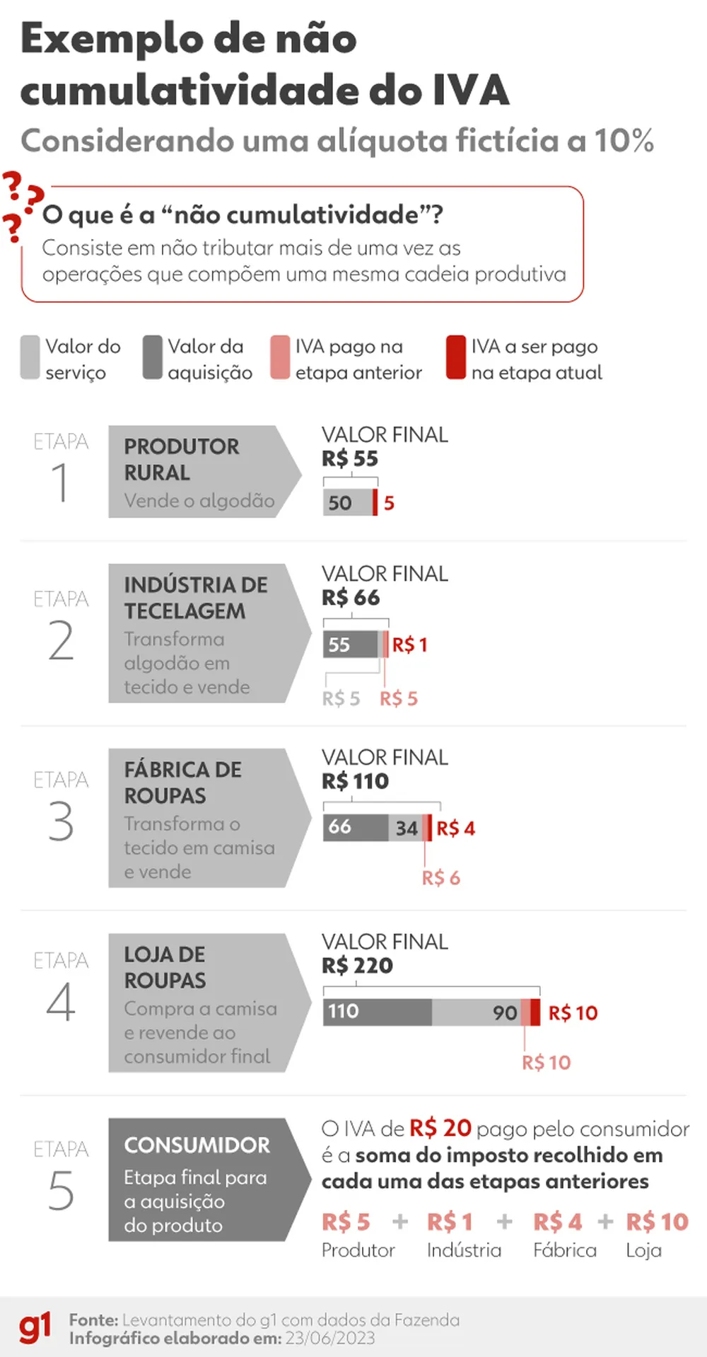 Na reforma tributária aprovada pelo Congresso Nacional, os futuros IVAs (CBS federal, IBS estadual e municipal) serão não cumulativos, ou seja, os impostos não incidirão sobre valores tributários já pagos em etapas anteriores da cadeia produtiva. E os valores serão cobrados no “destino”, ou seja, onde os produtos e serviços são consumidos.